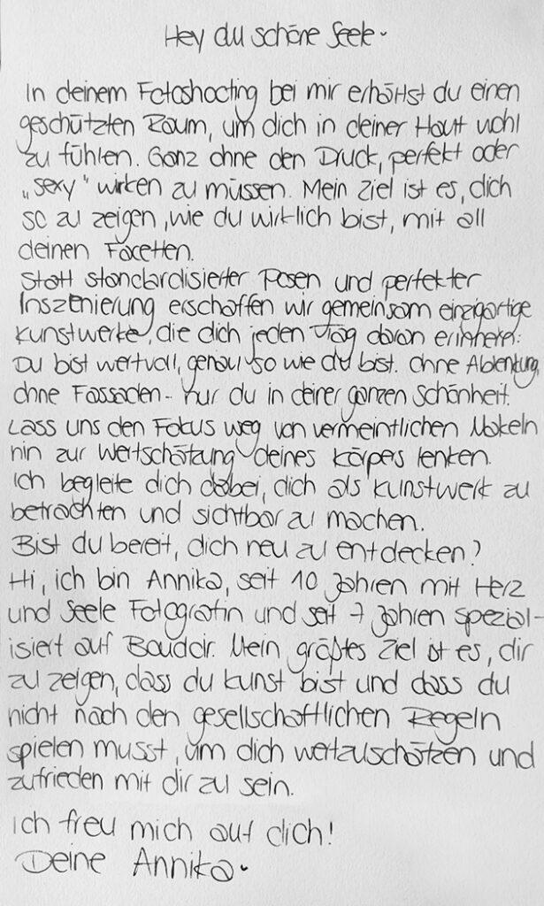 "Das Shooting und die gemeinsame Zeit mit dir haben mir so unfassbar viel Spaß bereitet! Es war fast wie als würde man bei einer guten Freundin sitzen. Einfach toll. Ich habe mich bei dir im Studio super gefühlt und die Aufregung war ganz schnell verflogen."